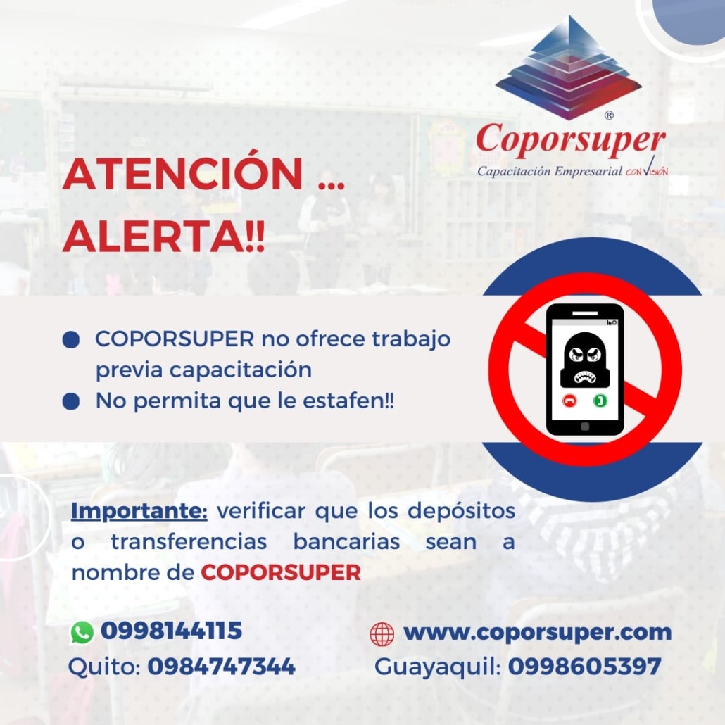 Coporsuper informa a sus clientes y público en general que los canales oficiales de comunicación son; en la ciudad de Quito al correo electrónico, capacitacion@coporsuper.com, en la ciudad de Guayaquil al correo electrónico, capacitaciongye@coporsuper.com y contacto comercial a nivel nacional al WhatsApp 0998144115